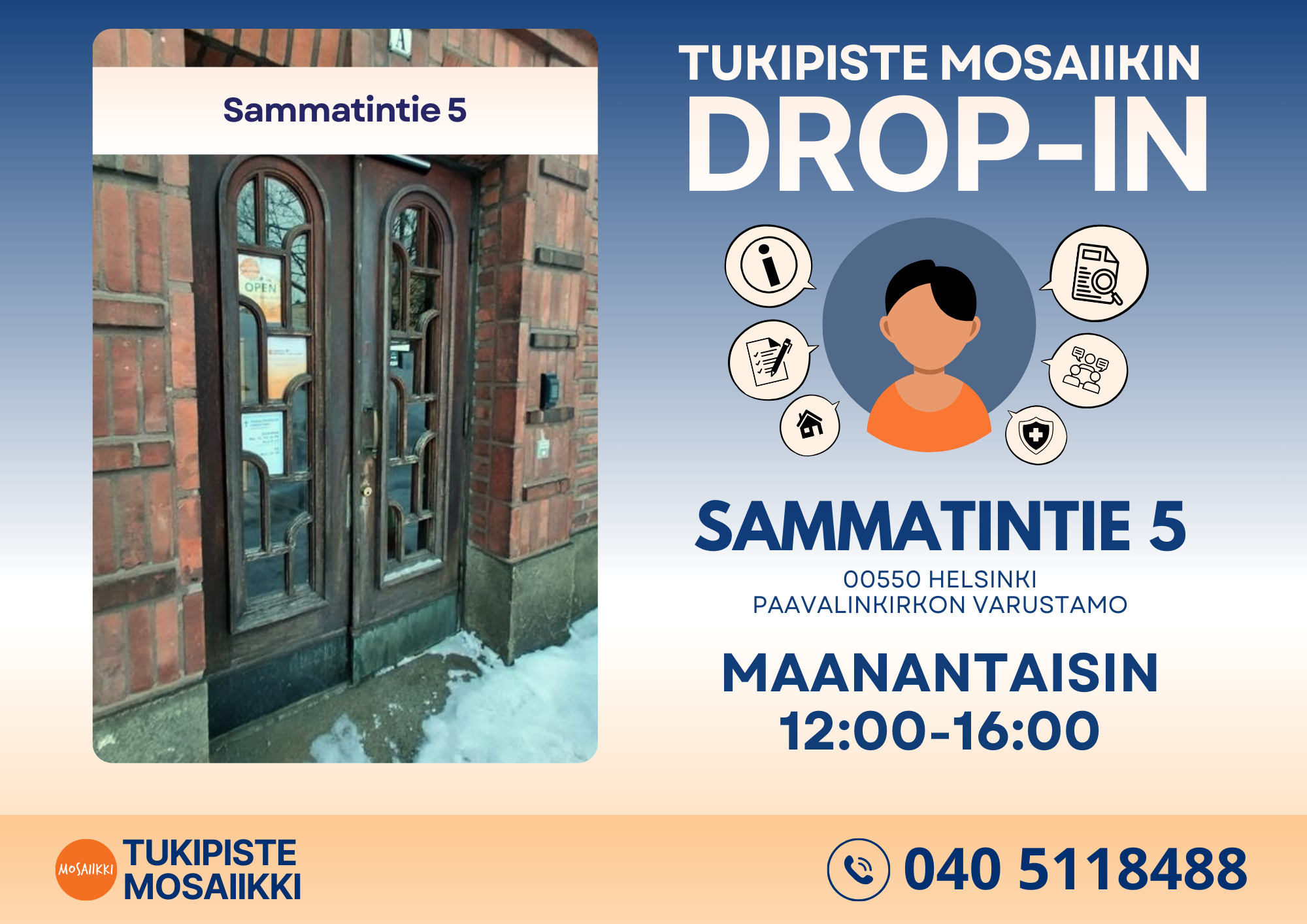 Olemme Mosaiikissa erityisen kiitollisia lämpimästä vastaanotosta ja siitä, kuinka yhteinen arki on alkanut rakentua vakaasti ja toiveikkaasti. Tuntuu hyvältä olla osa tätä yhteisöä, ja on upeaa nähdä, että alueen eri toimijat muodostavat yhdessä vahvan ja helposti saavutettavan palveluverkoston paperittomille ja paperittomuuden uhan alla oleville henkilöille, vaikka tilat ja osoitteet välillä vaihtuvatkin!